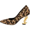 Laissez-vous séduire par ces escarpins à imprimé léopard, un parfait équilibre entre style sauvage et raffinement moderne. Leur design audacieux met en valeur un tissu effet poils léopard qui attire le regard, tandis que le talon doré sculpté apporte une touche de luxe et de féminité.