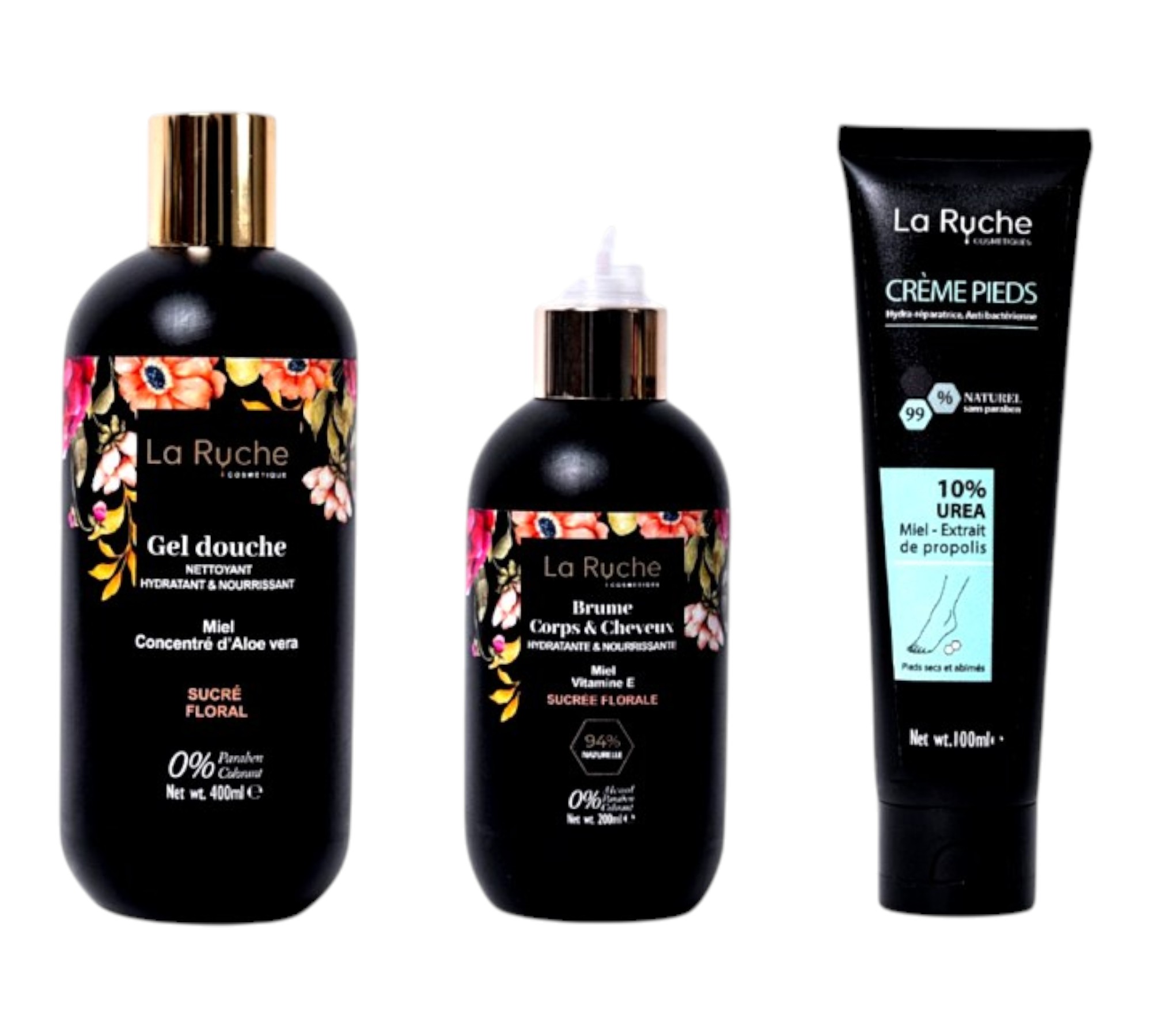 Un rituel complet pour le corps, de la douche à la brume parfumée, jusqu’aux pieds. Gel douche doux, brume sans alcool pour le corps & les cheveux, et crème pieds réparatrice à l’urée, propolis, jojoba et miel.