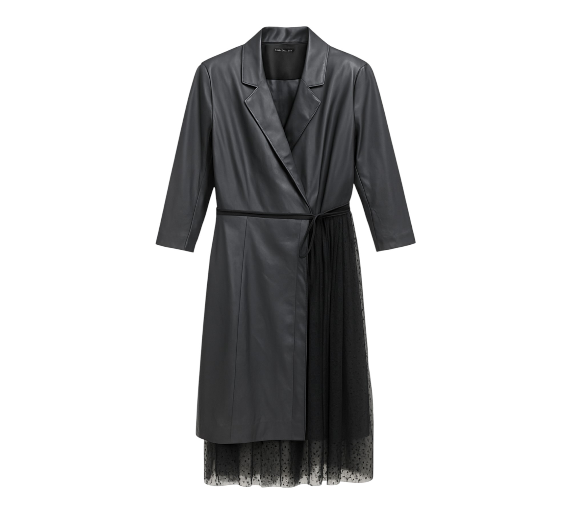 Le design signature combine un col surdimensionné qui crée du volume et de la présence, avec une ceinture intégrée au niveau de la taille qui définit magnifiquement la silhouette. Le détail le plus particulier et séduisant est la jupe en dentelle noire élégante ornée de motifs à pois délicats.
