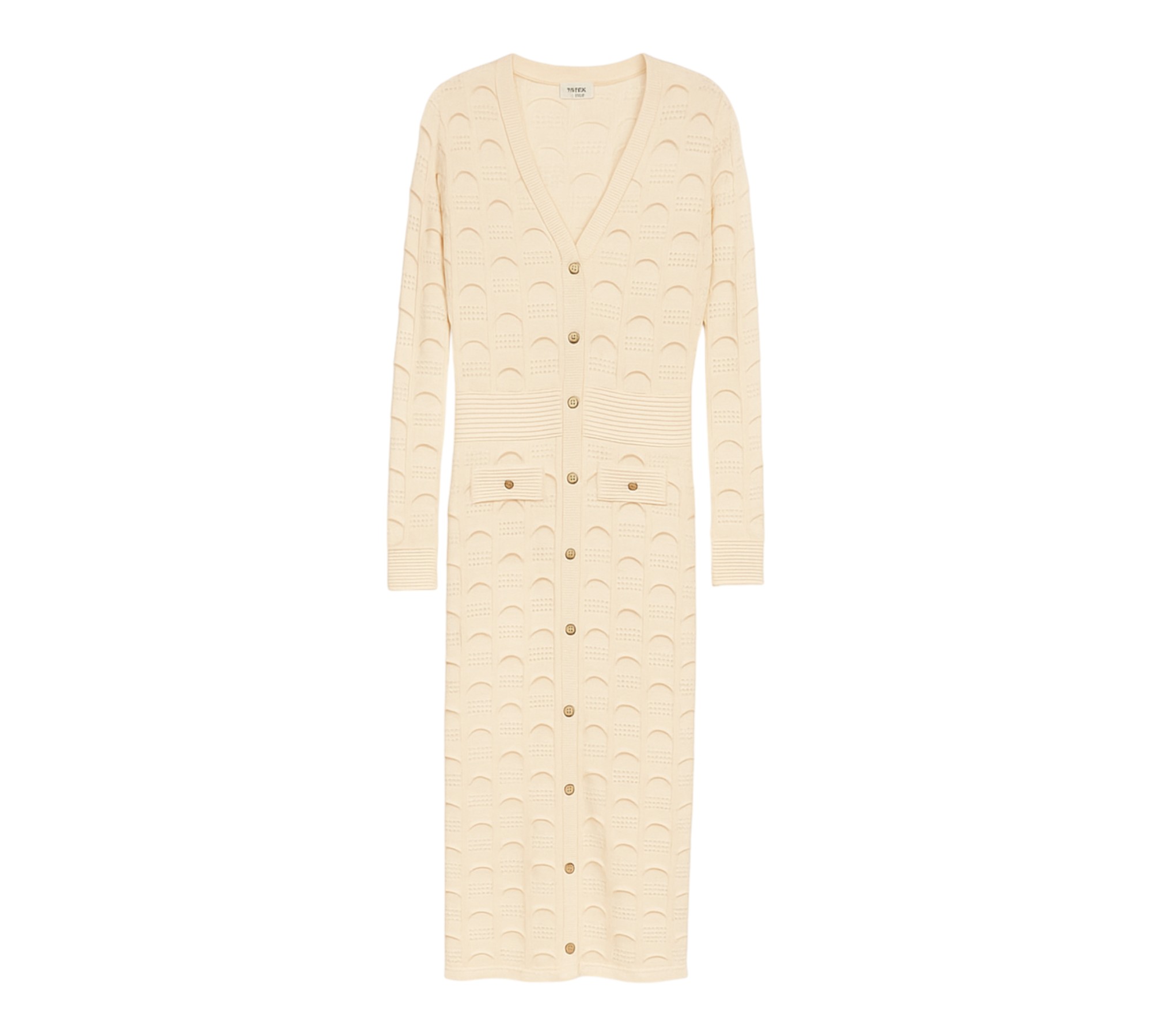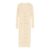 Robe crème motifs géométriques texturés, boutons marron, détail rayé à la taille, col V. Pièce élégante et confortable.