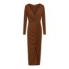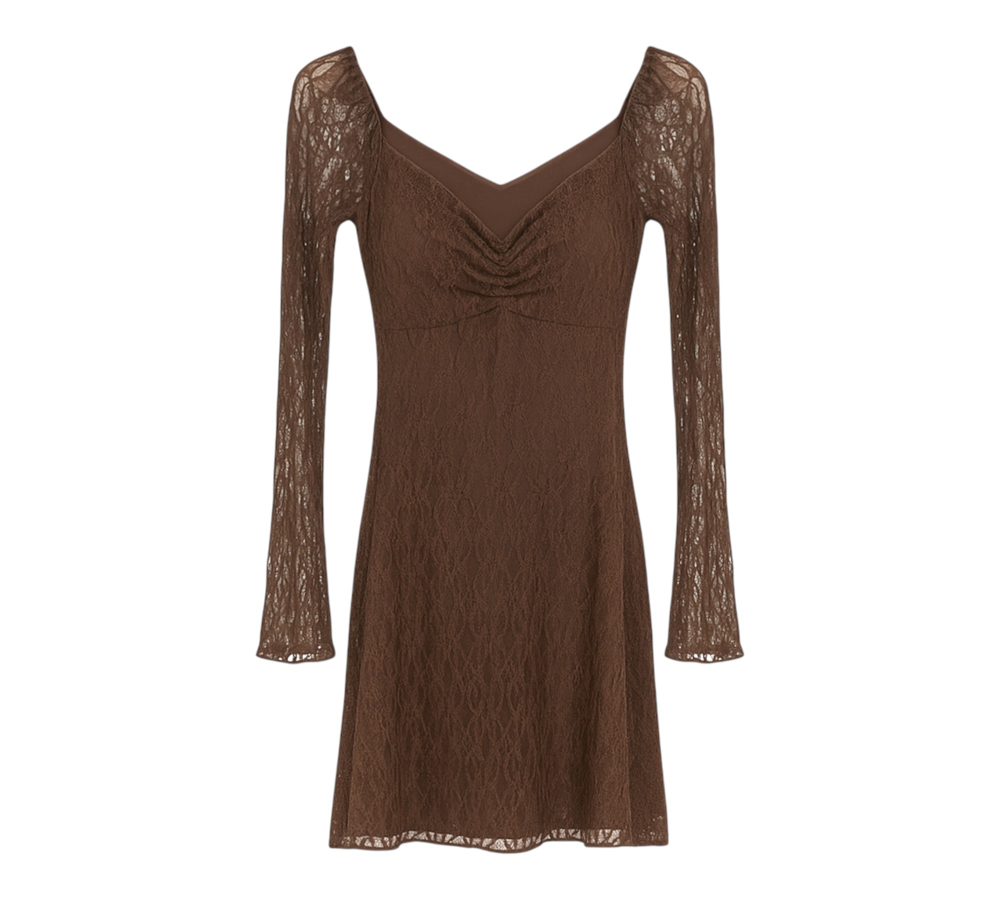 Robe dentelle marron – Robe courte dentelle marron/taupe, col drapé, manches longues évasées. Style bohème et féminin.