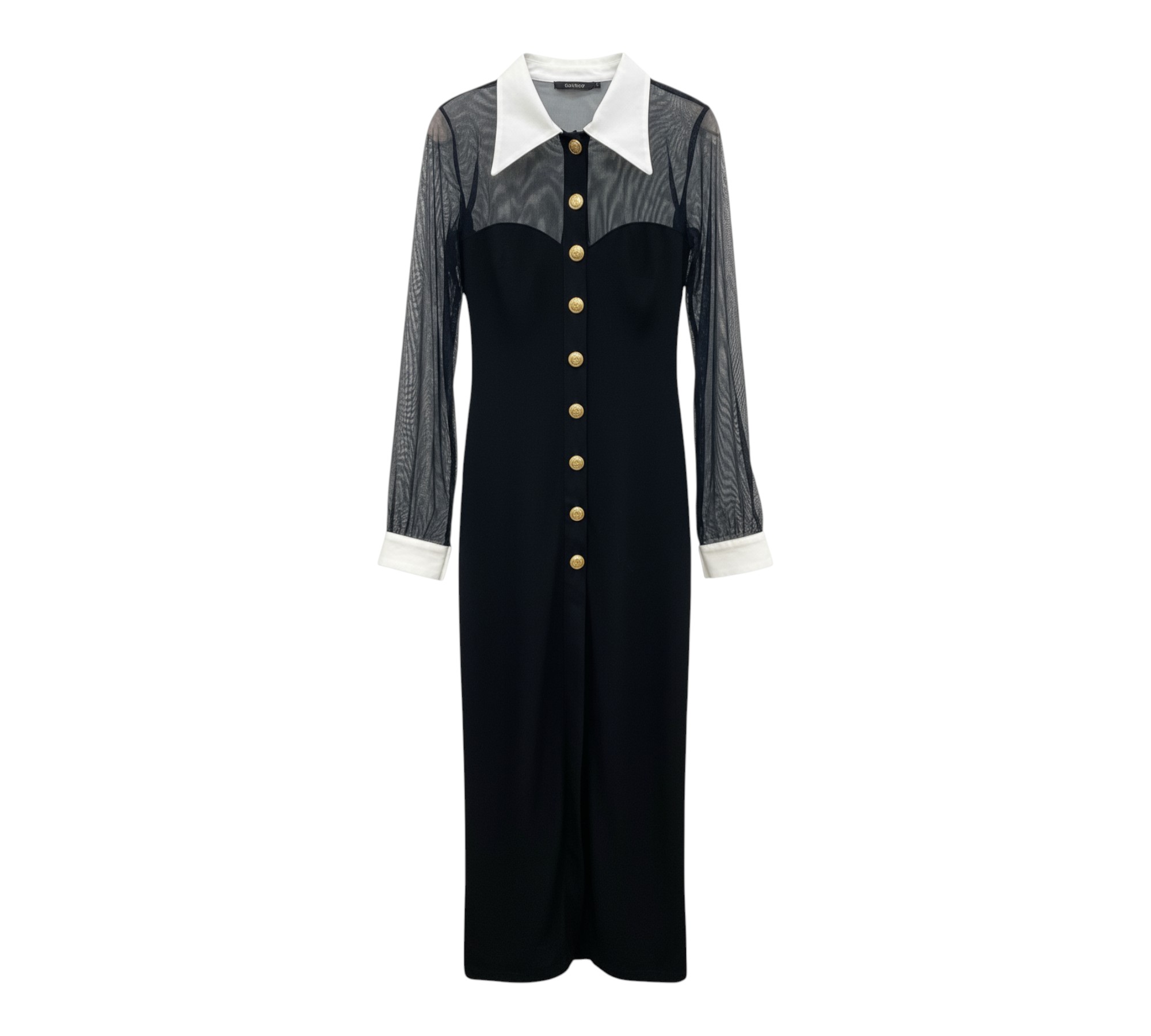 Les manches longues en mesh gris texturé avec motif ondulé apportent une touche de sophistication contemporaine et une transparence subtile. Les boutons dorés premium qui structurent l’avant ajoutent une dimension de luxe et de prestige. La coupe légèrement cintrée met magnifiquement en valeur la silhouette sans contrainte.