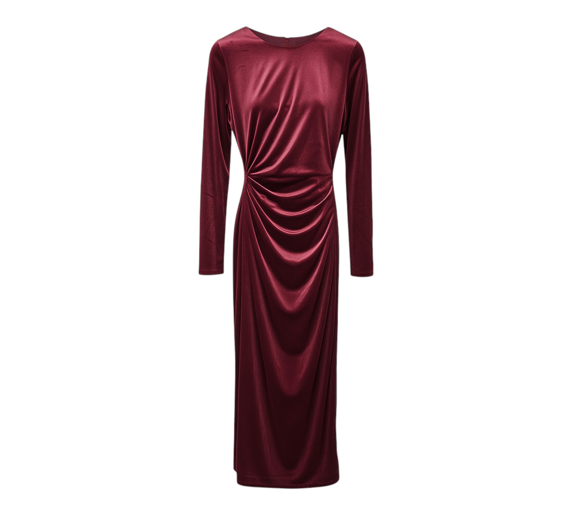 Robe velours bordeaux drapée – Robe portefeuille velours rouge vin, détail froncé asymétrique, encolure ronde, manches longues. Élégance et sensualité assurées.