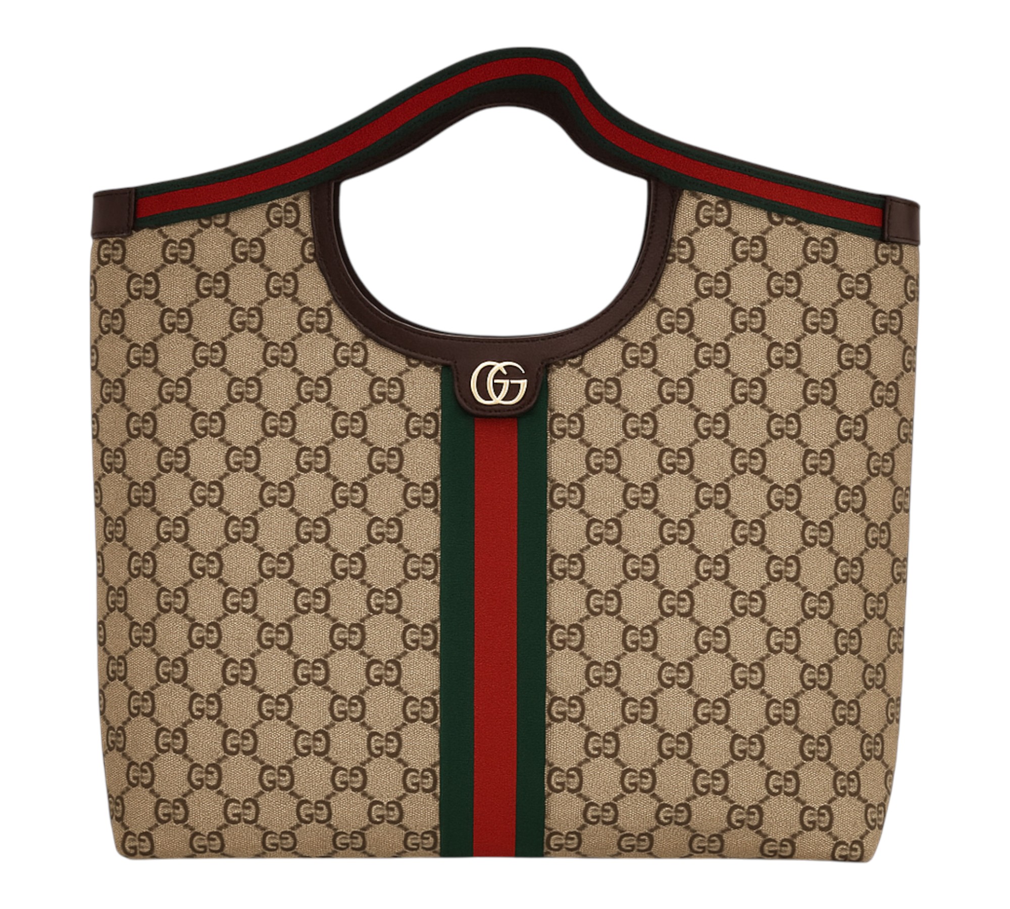 Il s’agit d’un sac cabas Gucci Giglio confectionné en toile GG beige et marron foncé, sublimé par la bande Web iconique verte et rouge